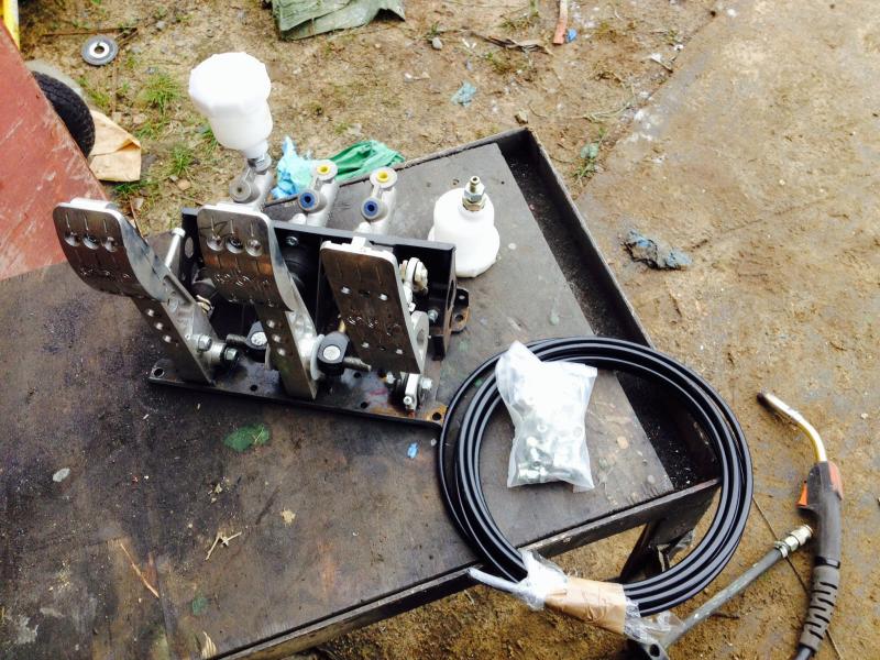 -pedal box, lattiamalli koneistetuilla alumiinipolkimilla, ollut sovituksessa autoon, ei ikinä laitettu nestettä sisään. Todella tukeva.