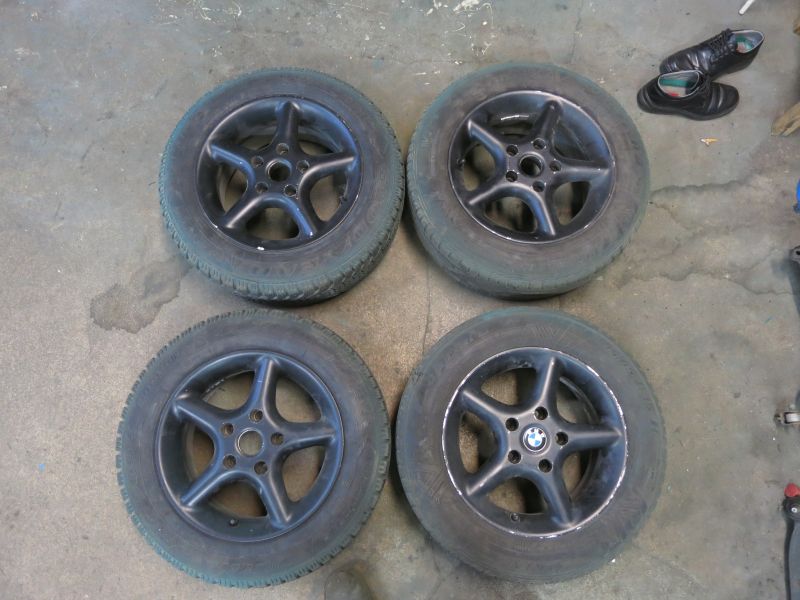 Olleet e36:ssa. 5x120 15x7 ET35 kilikalimustat, päällä suojana hajasarja surkeita kumeja.