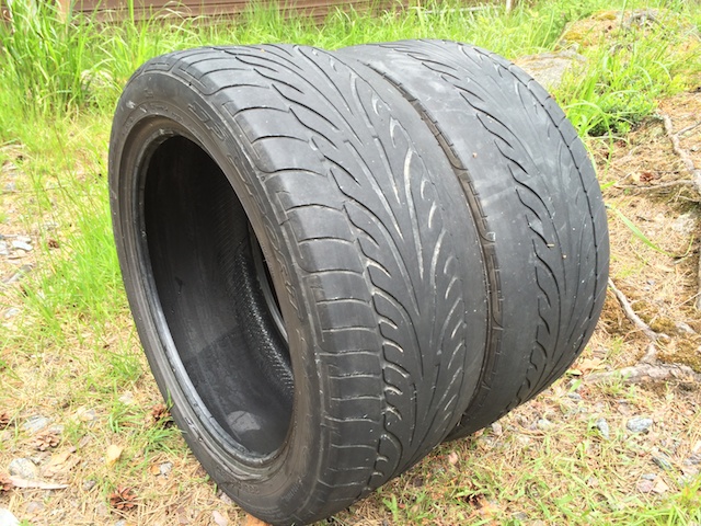 Myynnissä pari huono kuntoista rengasta. Ei näillä pahemmin liikenteeseen varmaan enää lähdetä, mutta kai noi voi vielä loppuun poltella. Pintaa varmaan milli tai pari ja sisäkantilta sileä.