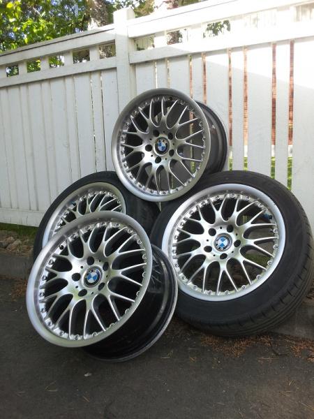 17" x 8,5", 5x120, et20. Ostettu vuonna 2004 KM Däckistä ja siitä asti pyörineet oman kotteron alla. Kahdessa päällä melko loppuunajetut 235/45R17 Kumho KU39 kumit.