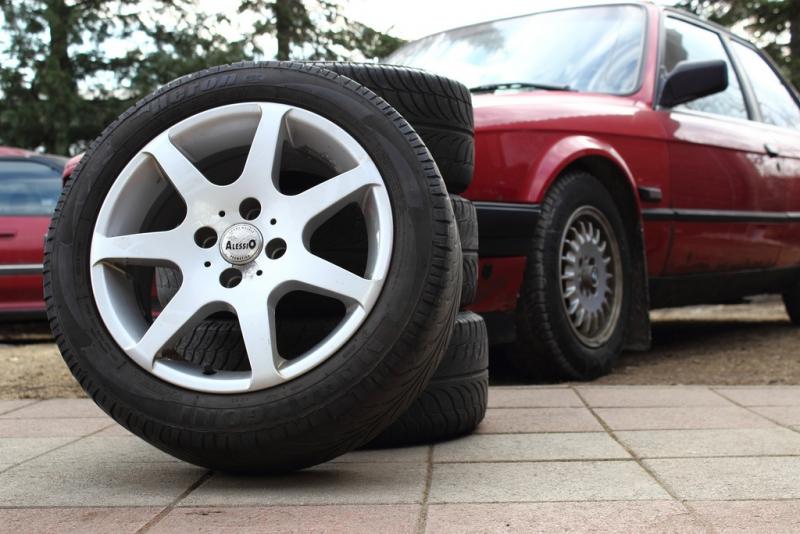 Olleet E30 bemun alla, renkaissa pintaa vielä yhden kesän ajoihin. Kolmesta vanteesta maalit lähteneet lohkeilemaan, yksi parempikuntoinen.