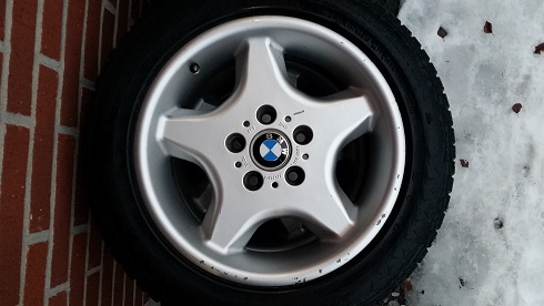 Ylimääräisenä E39: ssä olleet 16" originaalit Style 16 alut. Päällä talvirenkaat nastoin 205/55/16 kokoa. Pintaa kaikissa hyvin, mutta kahdessa renkaassa melkoisesti nastoja lähtenyt, keskiöt mukaan tietenkin.