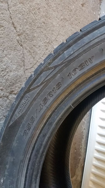 Tarpeettomaksi jääneet renkaat E38:n alta. Molemmissa näytti olevan auton edellisen omistajan jäljiltä ns. "koiranpaska"paikkaukset, kts. kuva, itsekin huomasin nuo vasta renkaanvaihdon yhteydessä. Valmistusviikko 04/12.