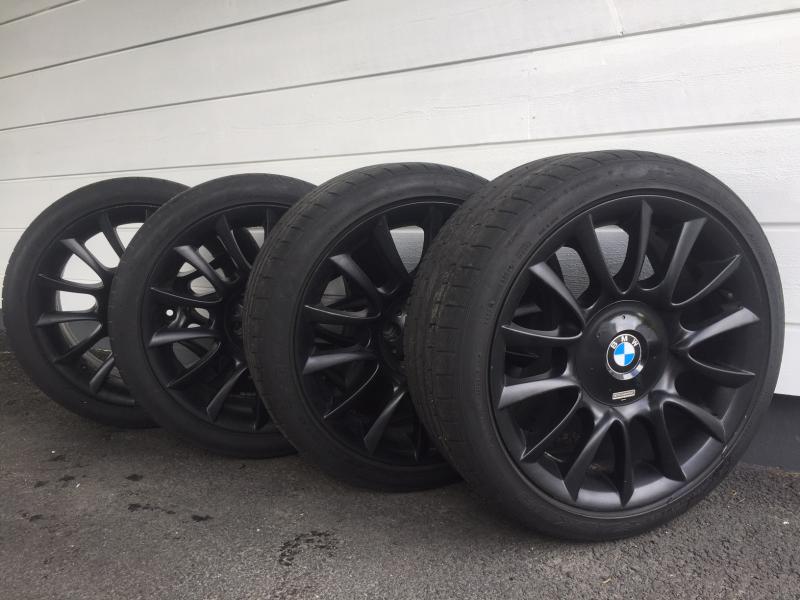Borbetin valmistamat BMW:n alkuperäiset vanteet e91 alta. Maalattu joskus mustaksi. Yhdestä keskiöstä puuttuu individual merkki.
