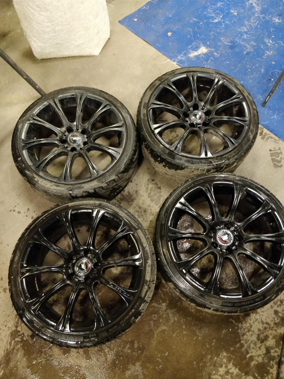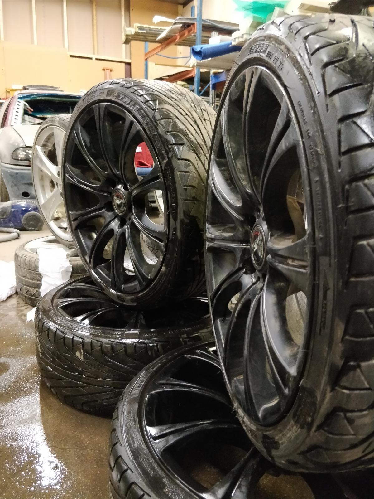 Myynnissä 19" vanteet renkailla, maali hieman lohkeillut, muuten hyvä kuntoiset vanteet ja renkaat.