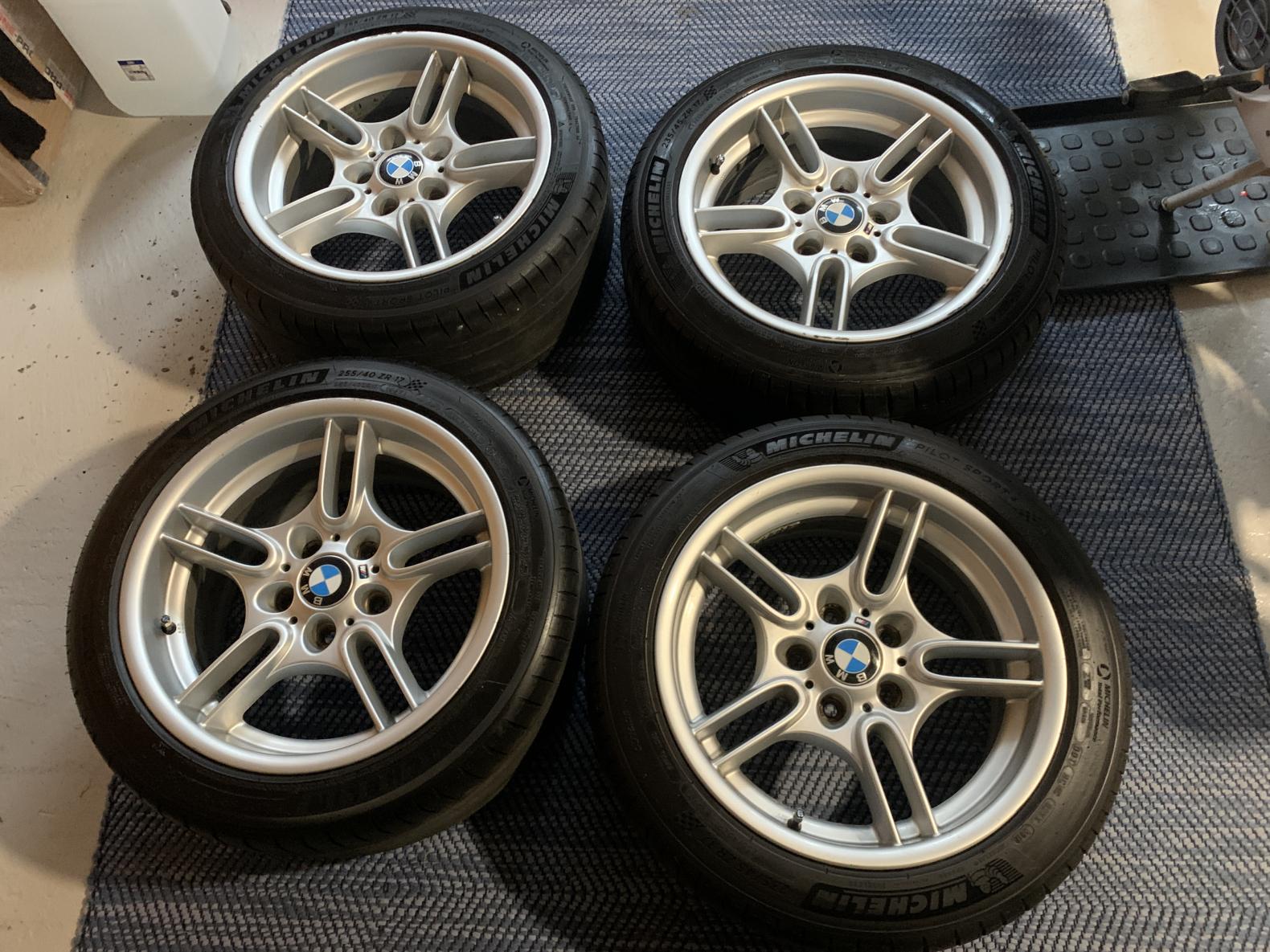 Takaset 9x17tuumaa, jako 5x120. Michelin Pilot Sport 255/40/17 kumit vaihtokunnossa.