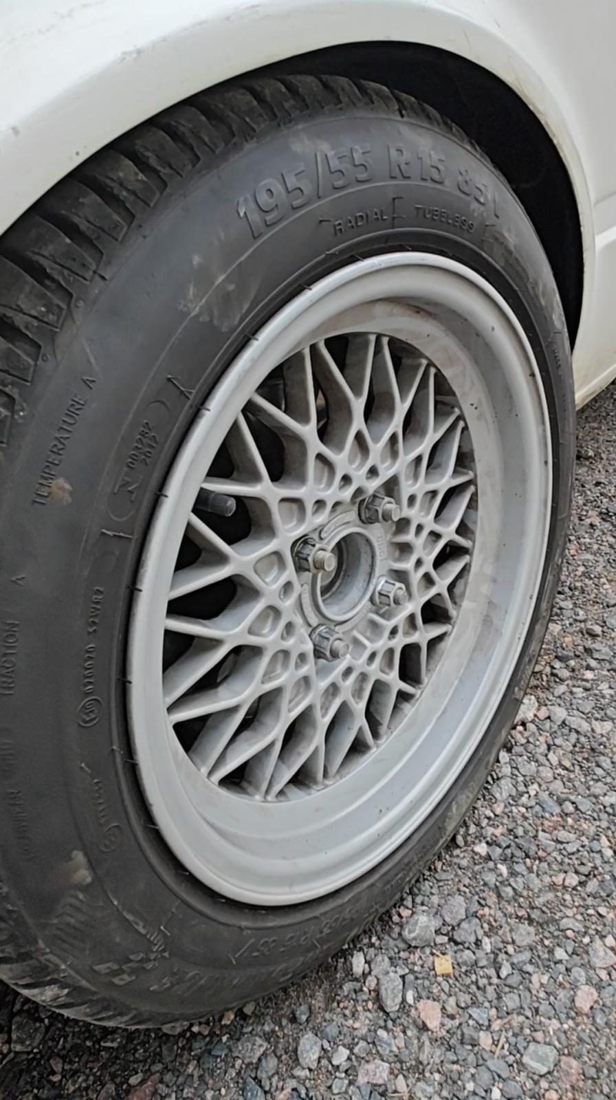 Etuvanteilla on vielä hyvät 195/55 katurenkaat ja takana vaihtokuntoiset 205/50 semit. Voidaan myydä renkaiden kanssa tai ilman. Hinta sama.