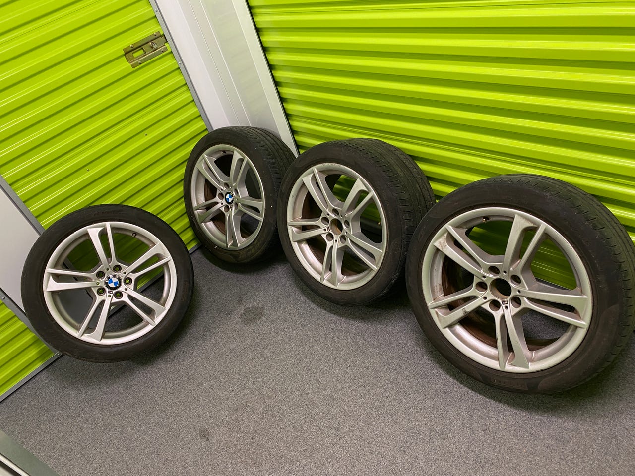 BMW original 19"/8,5" ET38 (2kpl) + 19"/9,5" ET48 (2kpl) vanteet. Made in USA. Suorat ja siistikuntoiset vanteet. Päällä loppuunajetut kumit. Kumeille en laske arvoa, pelkkiä vanteita tässä myydään. Löytyy 4kpl keskimerkkejä..