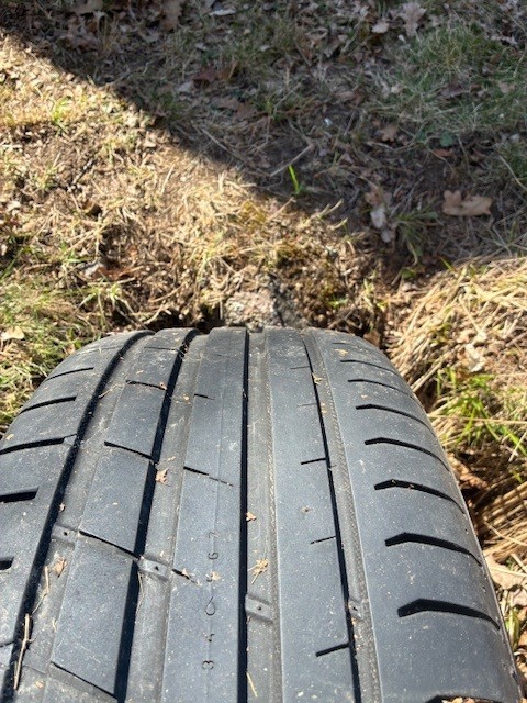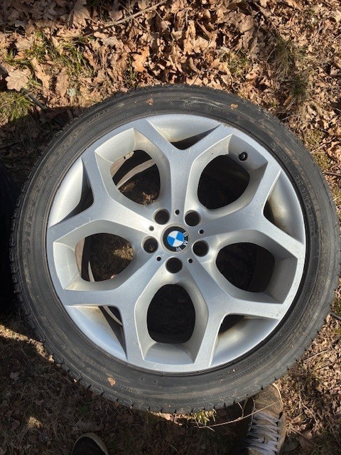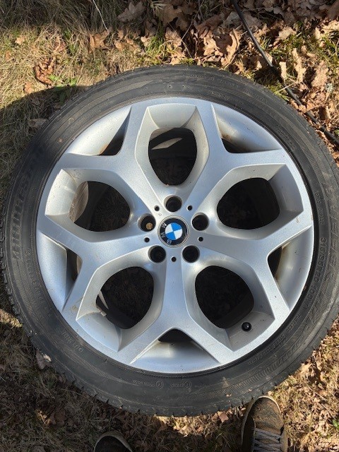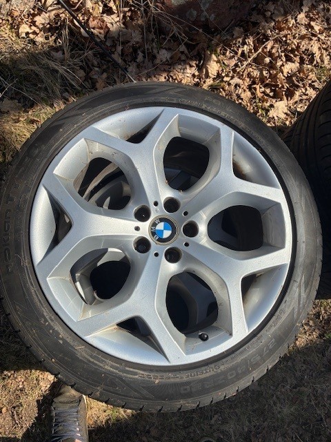BMW alkuperäiset 20-tuuman style 214 vanteet kesägummeilla. Edessä Nokialaiset, takana Bridgestone Dueller. Molemmissa pintaa reippaasti jäljellä.