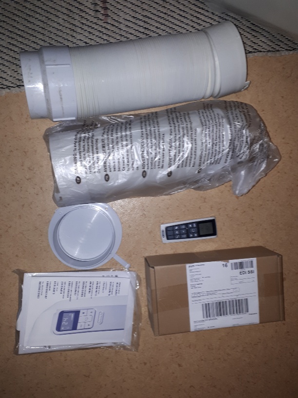 Mukaan käyttämätön, uusi kalkkisuodatin (40) ja kaksi poistoilmaputkea joista toinen käyttämätön varakappale.