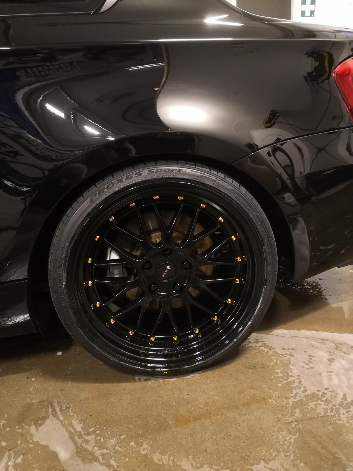 Kesällä semit samaa kokoa kuin talvirenkaat ja kesätie pyörii sama edessä kun em. ja takana 255/35/R18, mankeloitu on toki.