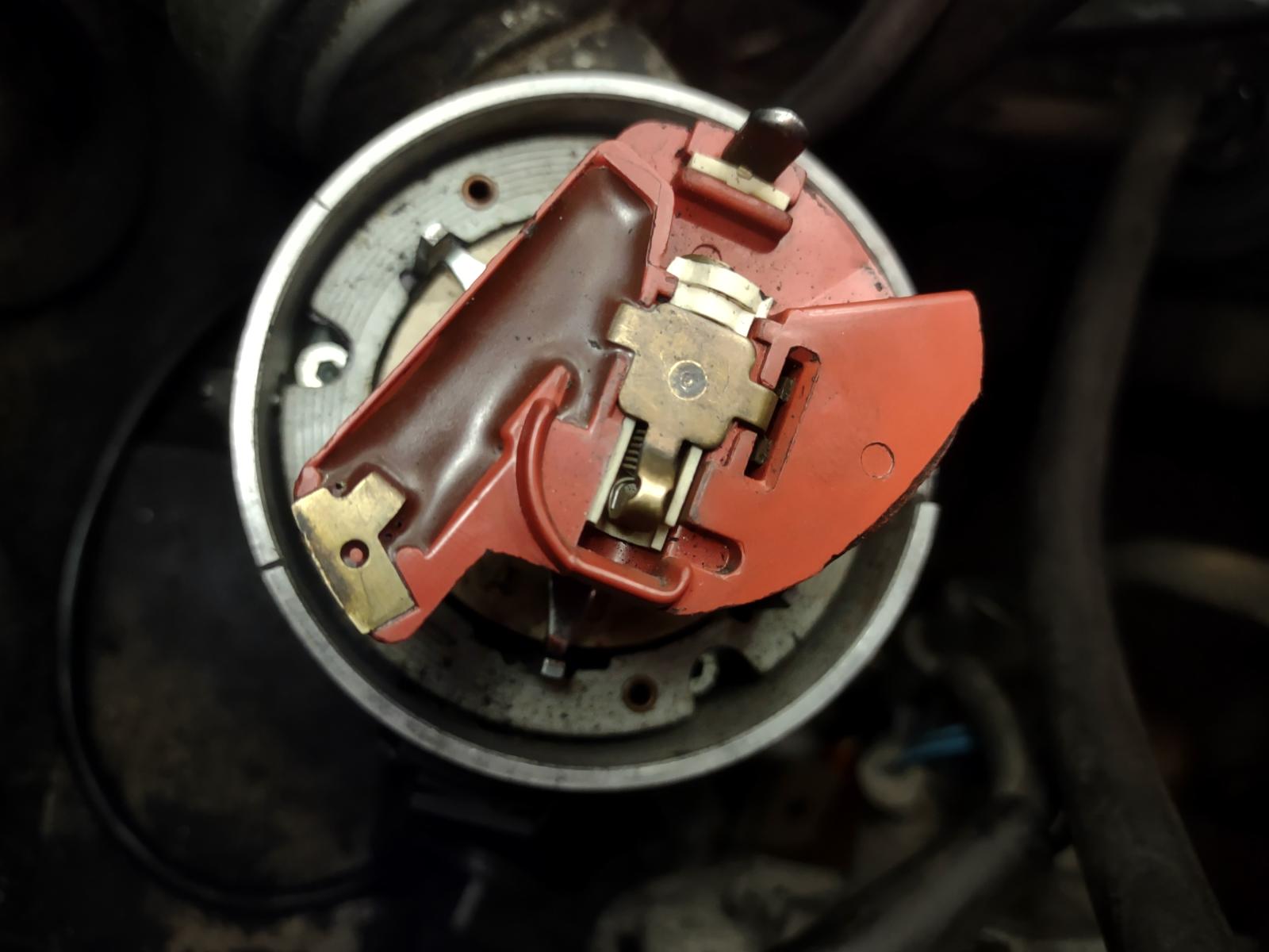 Tuossa pari kuvaa jakajalta kun kone on jakopään merkkien mukaan TDC, tuo pyörijän kärki osoittaa 1.johtoon jos nyt laittaa jakajan kannen paikoilleen ja tuo jakajan rungossa oleva pieni lovikin sattuisi siihen kohdalleen:think