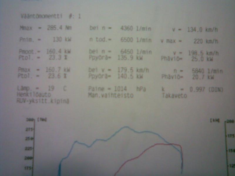 Oisko teillä antaa takapyörätehoja mittauksista? Tunnettu tosiasiahan on että optimistisilla korjauskertoimilla saadaan muhkeita moottoritehoja. Tehodynamometrit sopivat mielestäni paremmin muutosten arviontiin esim. virityksissä kuin todellisen moottoritehon mittaukseen.