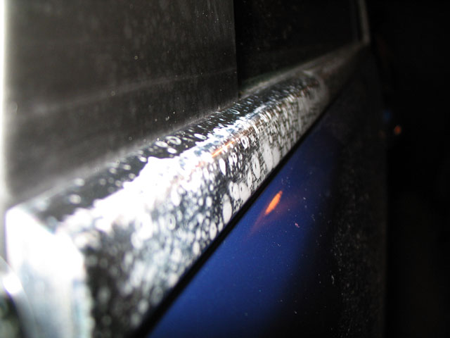 Käytin auton käsinpesussa ja vahauksessa, laiska kun oon. Hakiessani autoa huomasin, että ikkunoiden ympärillä olevat kromilistat olivat aivan laikukkaat, muoviset enemmän kuin metalliset, mutta joka paikassa näkyi kuitenkin jälkiä. Lisäksi ovien välisen pilarin puolihimmeässä mustassa pinnassa näkyi selkeitä täysin himmenneitä laikkuja samoin kuin pyyhkimien varsissa.