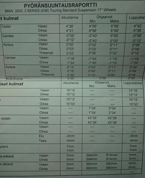 Kiitti kommenteista! Hunter 400 antoi ohjearvoiksi e46 + sport ripustukselle ja 17" renkaalle aurausta eteen 0°05' - 0°10' ja taakse 0°05' - 0°11'. Miten e46:ssa vaikuttaa auraus edessä/takana? Tai miten tuo liiallinen camber edessä tuntuu käytännössä? Eihän sitä katuajossa tarvis juurikaan olla, ihmetytti melko isot camberit taakse mitä suositellaan..