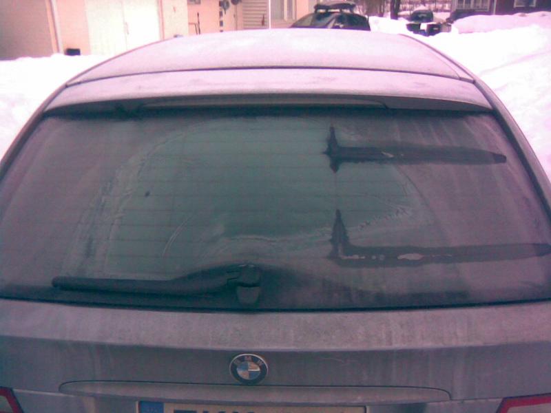Syytä en voi ymmärtää, mutta se nyt on sivuseikka. Takaluukun lasiin oli jääny ikävästi semmonen paskaliimapinta, jota ilmeisesti oli koitettu raaputella pois jollain.