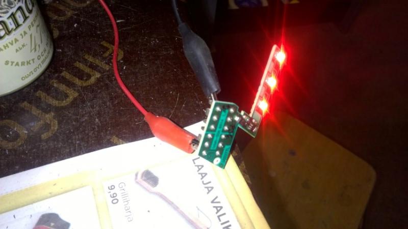 Ei muuta kuin purkamaan. Vika löytyi piirilevystä, jossa tinaa käytetty säästeliäästi ja pientä kosteutta. Mietin pitkään alanko lämmittämään ton lampun kupua irti, mutta näin jälkikäteen voi sanoa että oikea ratkaisu oli mennä dremelillä takakautta sisään. Ledit lähti tuikkimaan kolvaamalla piirilevyn juotokset uudestaan (lämmittämällä, ei lisätinaa).