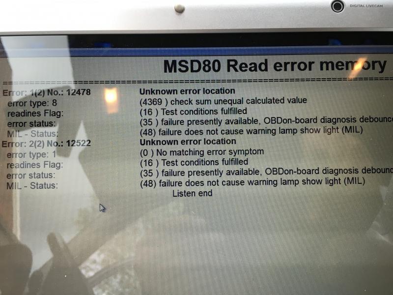 Bmw e90 2.0l vm.07 tarjoaa pari vikakoodia.