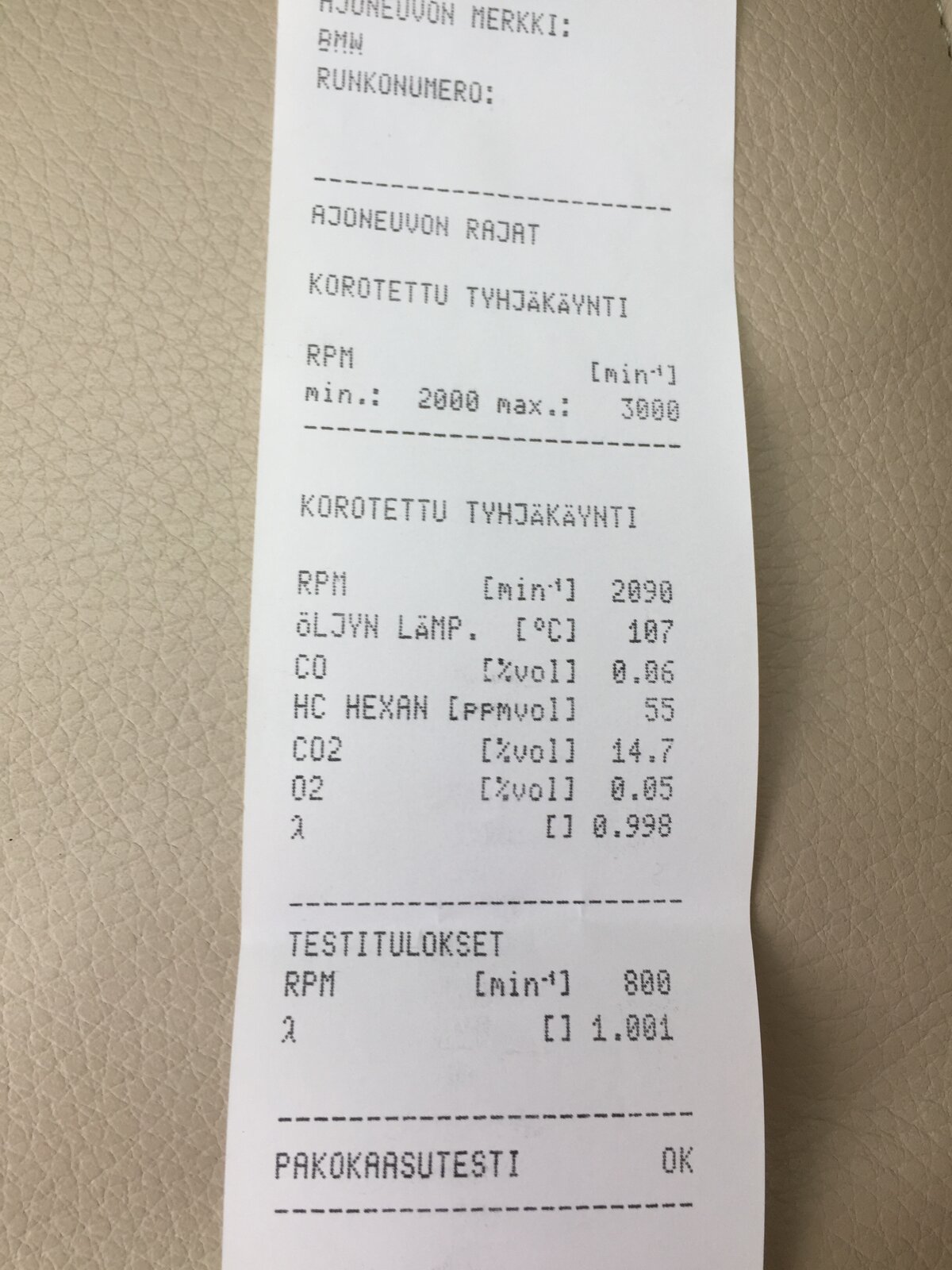 Joku viina seos tankissa ja viina softa sisällä, enää en muista mikä. Auto ollut seisonnassa ja välillä käytetty talvella. Leimalle ajoin muutaman km matkan ja annoin käydä tyhjäkäyntiä mutta lämmöt ei kerenneet kunnolla nousta, eikä pitoja kesä renkailla et olisi käynyt ottamassa vetoja. Ilman mitään ongelmia tuli päästöt ja etu kissat pois, putkisto catback tehty.