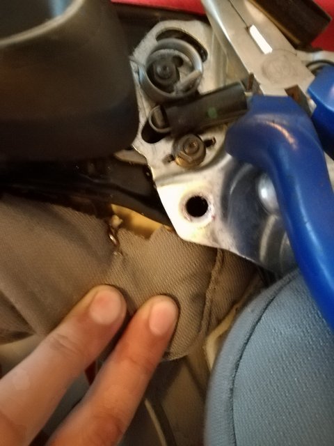 Vyön irroitus penkistä. Varovasti takaa ylös/oikealle kääntämällä lähtee muovi vyön pultin edestä. Etuosassa on kieli eteenpäin joten kun takaa saa raotettua riittäväsi niin muovi lähtee kokonaan irti taaksepäin vetämällä.
