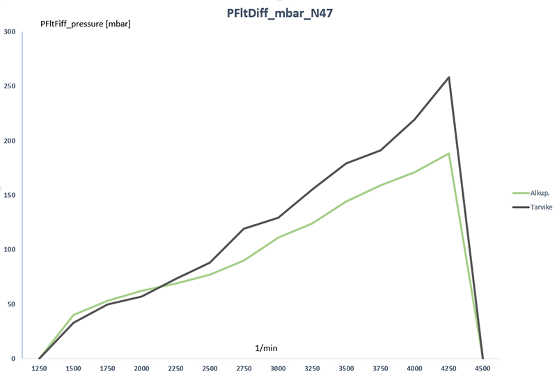 Monesti tarvike DPF kennot on vielä niin huonoja että jo uutena mitattu eropaine ennen ja jälkeen kennon on kuin paljon ajetussa alkuperäisessä. Ohessa diagrammi jossa uusi tarvike DPF vaihdettu pois ja uusi alkuperäinen tilalle.Last edited by Motorbit; 15-03-2016, 09:33.