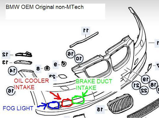 Olen tilannut M-sport etupuskurin 335i coupe E92:seen vakiopuskurin tilalle. Vaikka monessa paikassa mainostetaan, että M-sport puskuri sopii suoraan vanhan tilalle, ei näin kuitenkaan ilmeisesti ole. Esim vakiopuskurin jarrujen ilmanvaihtokanava jää M-sport puskurissa peittoon ja se on poistettava tai sitä on trimmattava. Oheisista kuvista selviää ongelma paremmin.
