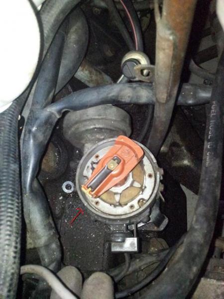 Punainen nuoli osoittaa jakajan rungossa olevan pienen loven. Näkyy olevan myös pyörijän kärjen keskikohta kokolailla sitä lovea kohti, joten sytkäsi on kohdallaan.