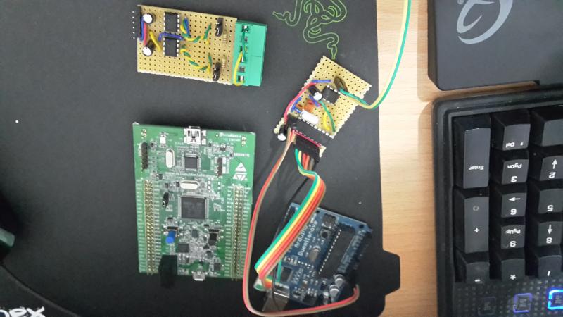 Kuvissa omat 'proto-viritelmät', arduino+spi2can-viritelmä ja stm32f4 discovery(168Mhz, hw-debuggeri st-link samalla levyllä jne.