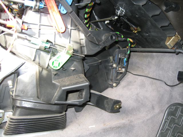 Näistä puheista innostuneena aloin vaihtamaan suodinta omaan 5/92 e34seen, jossa ei kylläkään ole minkäänlaista ilmastointia. Noh löyty kuvan mukaiset näkymät, eli ei paikkaa suotimelle :( Auto on vielä Saksasta uitettu. Jotain kyllä etukäteen kieli se, että etujalkatilan lämmitysrööri on autossa tuollainen kuvassa näkyvä nysä. Ilmakanavaa joka useissa ohjeissa neuvotaan ensin poistamaan ei ole ollenkaan.