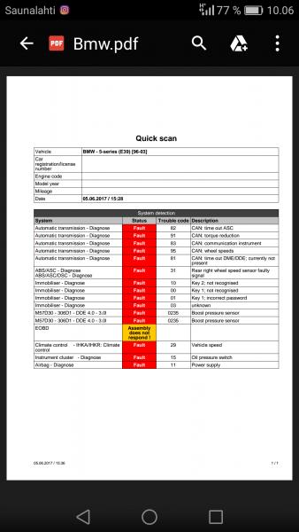 Moi, eli tollanen E39 530D -99 potilaana, ei lähde käyntiin, mutta kone kuitenkin pyörii kun avaimesta kääntää. Vikakoodeja antoi avaimesta, laitan kuvan alle. Ilmeisesti joku ajobesto päällä? Onko kellään ollut vastaavaa ja mitä tässä nyt voisi tehdä?