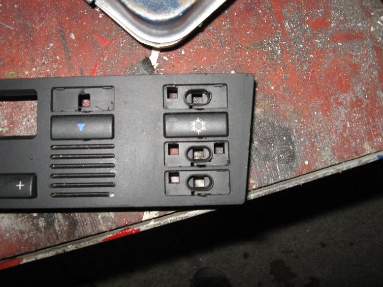 Nyt vihdoin kuvaa. Mielestäni tässä ei ole mistään muusta kyse kun heikkolaatuisesta muovista. Autolla on ajettu alle 150tkm (historia täysin tiedossa, huollettu uudesta asti maahantuojalla) ja ilmastoinninpaneelissa ei pysy nappulat kiinni, koska nappula-aukon alareunasta muovi on kulunut pois. Muutenkin tuntuu, että esimerkiksi e34:seen verrattuna kaikki muoviosat ovat hieman heppoisempia.