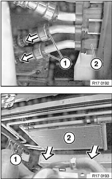 Visko, viskon kaukalo ja jäähdytin on ensin purettava edestä pois. Takaa paljastuvat molemmat öljyjäähdytimet. Oheisissa TIS:in kuvissa: Alemmat pikaliittimet tomaatin öljykiertoon, ylemmät tehostimelle. Kummankin jäähdyttimen pitäisi irrota erikseen tuosta yhteisestä liittimien muovituesta.E39 530dA -02 M-Sport