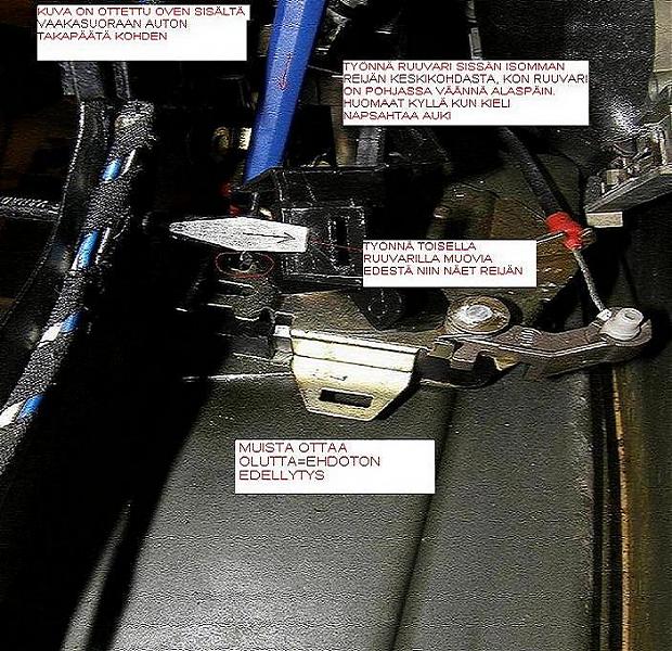 Ota fikkari, laske lasi alas ja kurki sinne oven sisääs sen listan raosta, kyllä sä pystyt, ku kaverin emäntäkin pysty (toyota carinasta toisin).