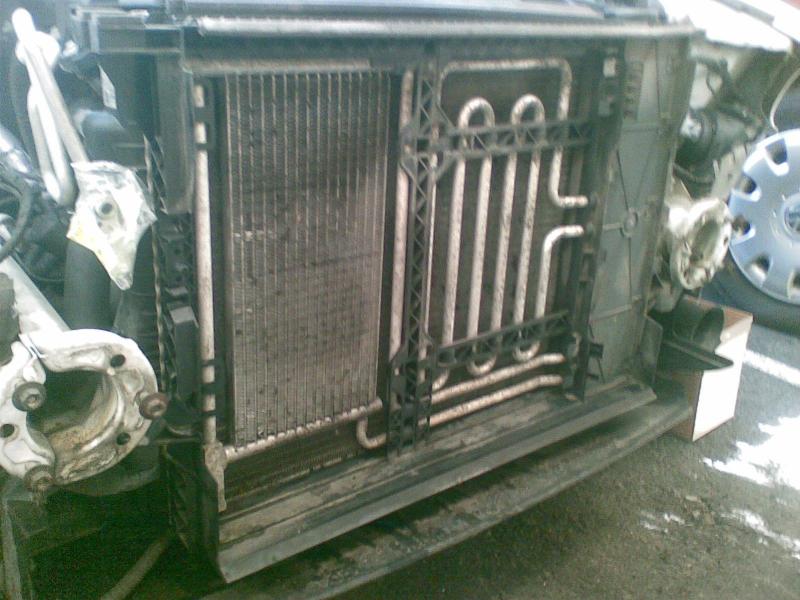 Tässä tältä palstalta taannoin löytämäni kuva. En tiedä kenen autosta se on, enkä nyt löydä searchillä tuota viestiketjua jossa tuo kuva oli. Tuosta kuvasta kuitenkin ilmenee, että nuo raudat voi purkaa edestä ja kennon kai saa sitten irti ilman jäähdyttimen irrotusta.