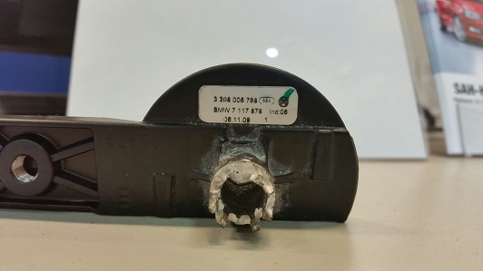 Normi öljynvaihtohuollon yhteydessa pyysin vaihtamaan takalasin mikrokytkimen. Vein uuden mikrokytkimen mennessäni ja sain kuvien mukaisen setin takaisin. Eli kiinnitysmutteli oli niin hapettunut akseliin, että oli kuulemma pitänyt porailla auki. Tulos näkyy kuvissa.
