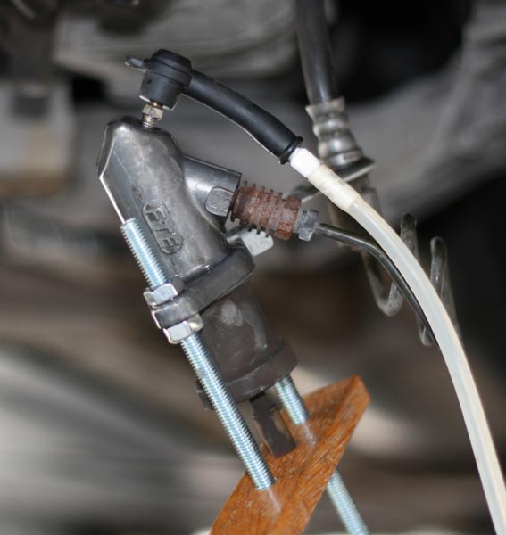 "Erikoistyökalulla" slave cylinder painetaan kasaan ja sen jälkeen linjan ilmaus onnistuu ilman ongelmia.