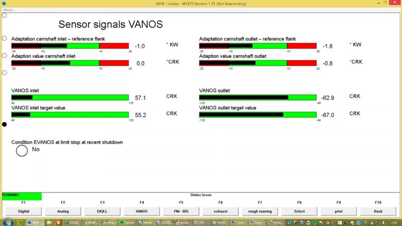Tarkastelin siis Vanosin toimintaa kaasutellessa ja sekä "vanos inlet", että "vanos outlet" arvot ja siis palkit liikkuivat kaasutellessa villisti. Eli vaikuttaisi että vanos ei ainakaan ole jumissa. Yläpuolella olevat "adaptation camshaft inlet" ja "adaptation camshat outlet" eivät reagoi ollenkaan kaasuun. Eli pitäisikö niiden edes reagoida kaasun asentoon? Vai voidaanko tehdä päätelmiä vanosin muuttuvista arvoista, että nokka-akselin anturit toimivat?