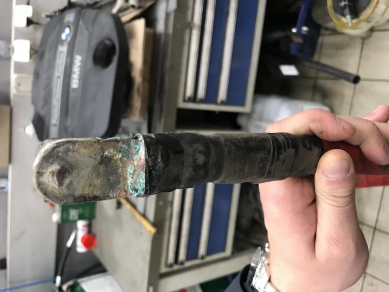 Noniin, vihdoin pääsin nosturille vaihtamaan kaapelia. Hommaan meni 4 tuntia ensikertalaisena, muutaman kaverin kanssa saatiin koko kaapeli kouruineen pois ja uusi samaa reittiä tilalle. Vanhasta kaapelista ei löytynyt yhtään hapettumaa läpiviennistä, mutta konehuoneen puoleisesta liitoskohdasta liitos oli hapettunut, liitteenä kuvaa.