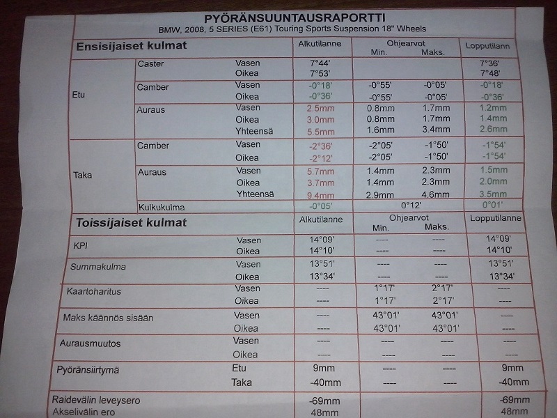 Pyydät sitten että kääntää kaikki camber varat mitä löytyy, eikä vaan just ja just ohjearvojen sisälle, niin kuin mulla tekivät.