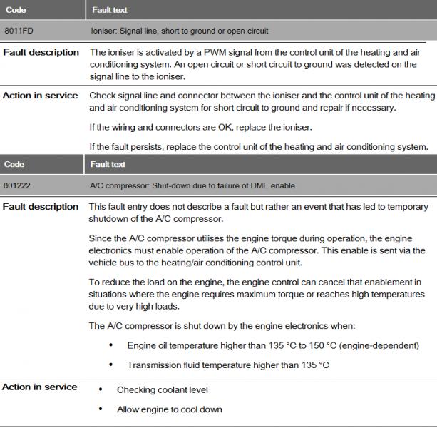 Myös minun F10:ssä tulee joka startissa tuo vikakoodi "801222 air conditioning compressor: switch-off due to missing dme/dde release"