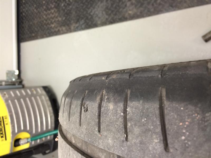 Tänään aloin tutkimaan tasonsäätö probleemia ja hämmästykseksi huomasin takarenkaan kuluneen sisäkantilta aika heikkoon happeen! Käytin auton keväällä suuntauksessa jonka jälkeen tullut 15tkm ajoa ja renkaat kulunu kuvan mukaiseen kuntoon.