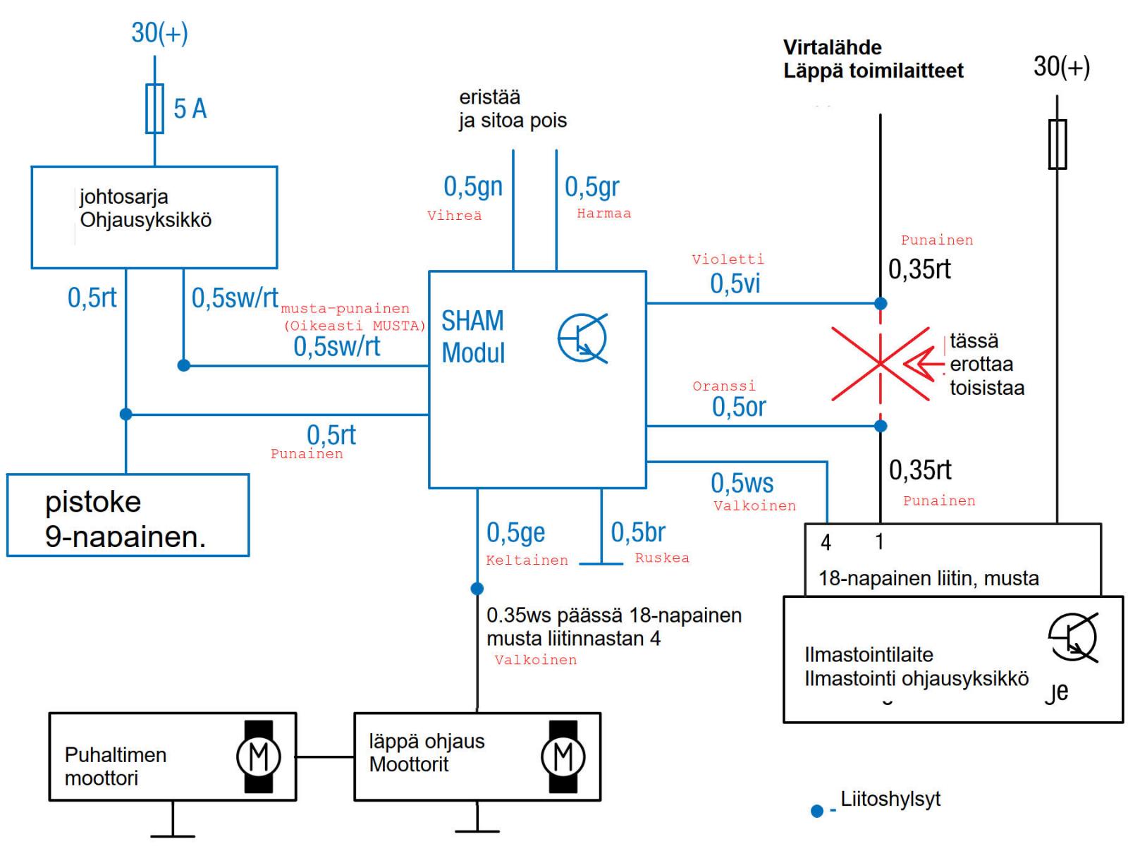 Kieltämättä hieman sekavan näköiset kytkentäkaaviot. Muostaakseni SHAM modulin mukana tuli hyvin selkeät ohjeet mikä piuha tekee mitäkin ja mihin kytketään autossa.