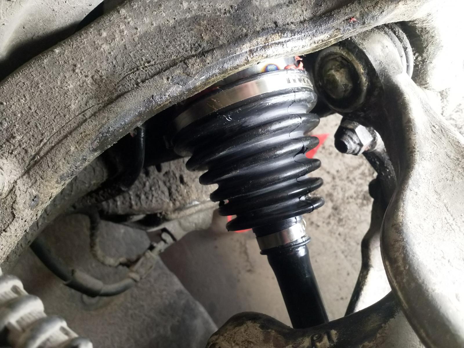 Tässä vielä kommentit Motonetin liimattavasta kumista, eli 165tkm kohdalla laitoin tuollaisen liimattavan kumin ulompaan niveleen ja tiukkasin kumin paikoilleen hyvälaatuisilla rosteriklemmareilla. Hyvin kesti ehjänä paikallaan yli 120tkm, kunnes vaihdoin koko vetoakselin. Tuo nivel naputti koko tuon matkan käännettäessä ja tiukkaan vedätettäessä, mutta ei siitä mitään harmia ollut. Nyt kun vaihdettiin reaktiotangot niin samalla tuli vaihdettua tuo koko vetoakseli, kun kerran niveliä oli muutenkin auki. Mutta tosiaan tuo motonetin liimattava kumi oli edelleen täysin kunnossa, ties miten pitkään olisi kestänyt. Ja vaihto todella helppo homma purkamatta yhtään mitään.