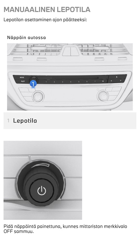 Mietin kans mistä helvetistä saa virrat pois. Päivittelin sitten carplaytä ja ohjeessa oli että sammuta ajotietokoneesta virrat. Siitä painaessa ainakin kaikki sisältä sammui eli tainnut siirtyä tuohon ”mankan” virtanappiin?Originally posted by TuomoA View PostKertokaapa tyhmälle onko näissä G30 minkäänlaista sammutus logiikkaa. F10 oli selkeä, kun ajat auton talliin, niin 2x start painiketta ja kaikki pimeäksi. G30, joskus osaa sulkea näytöt ja joskus taas ei. Tänäänkin kun kävin sisällä ja palasin takaisin talliin (väliä ehkä 10min) tallissa autossa valot päällä sisällä ja ulkona? Ihme joulukuusi.