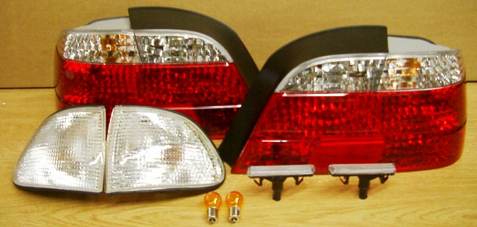 Stylingpaket E38-1 Stylingpaket 7er E38 bis Bj. 8/98 mit Facelift-Rückleuchten bestehend aus weißen Blinker, weißen Seitenblinker und rot/weißen Rückleuchten in klarglas Optik
