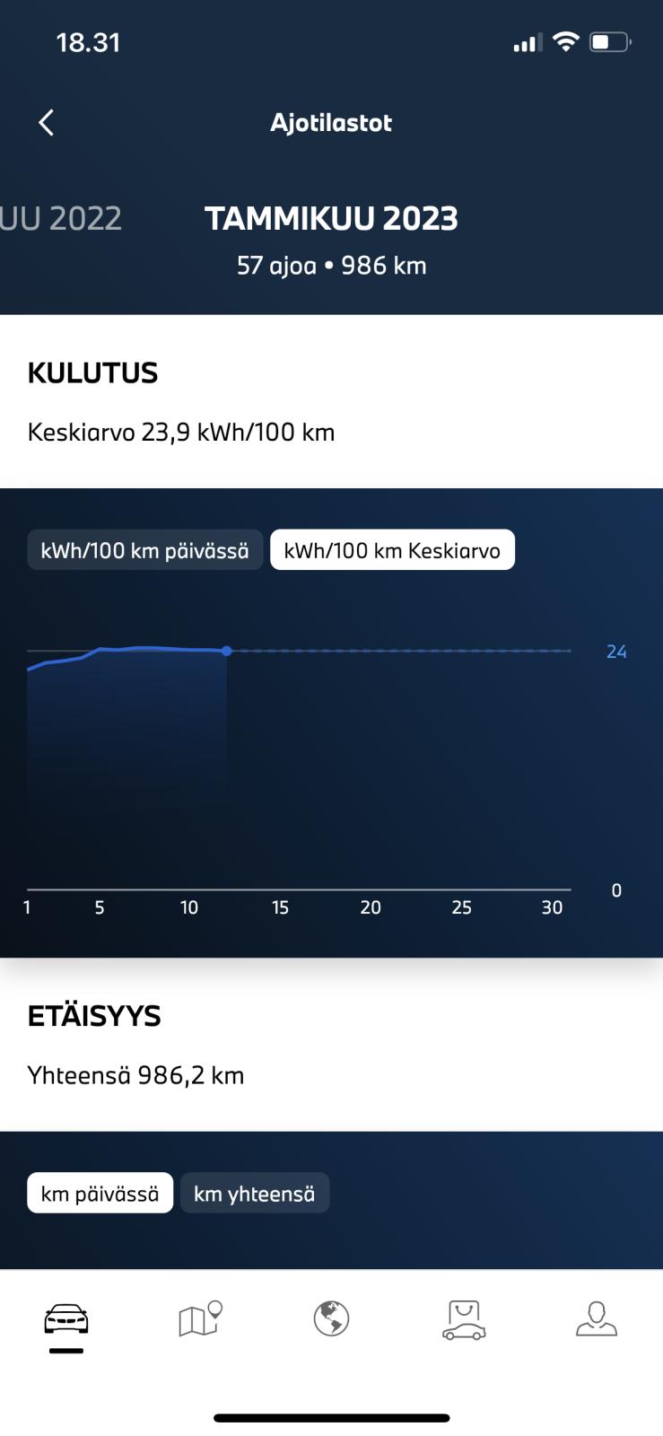 Toyotan kulutus näyttää lähentelevän jo 25kWh/100km. Muita en jaksanut alkaa laskemaan.