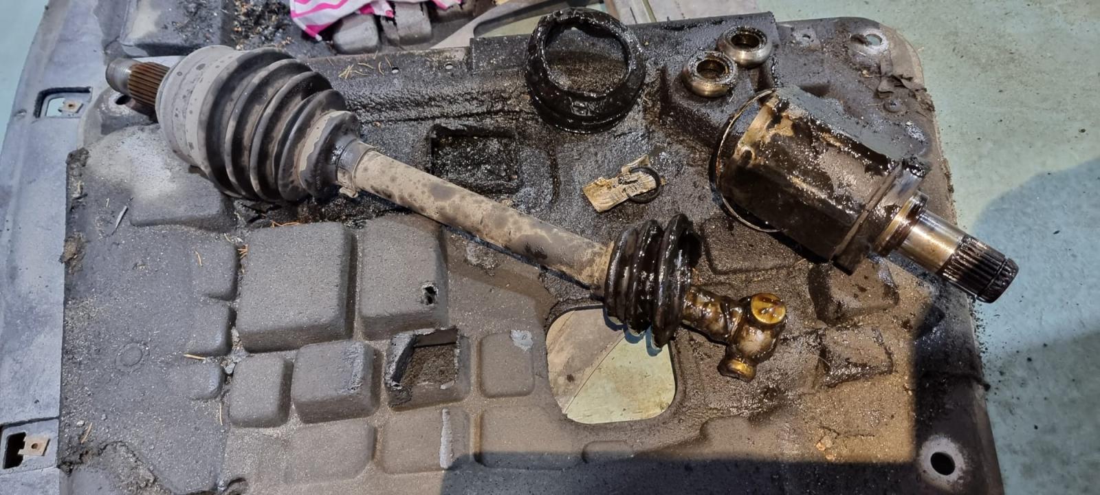 Tilaa uusi akseli, mittaa se että täsmää orkkiksen tietojen kanssa. Laita paikoilleen ja tunnustele kumin läpi onko sisemmän nivelen laakerit lähellä reunaa, jos on niin onko toisella puolella huomattavasti syvemmällä, jos on niin kone ei istu keskellä tms.