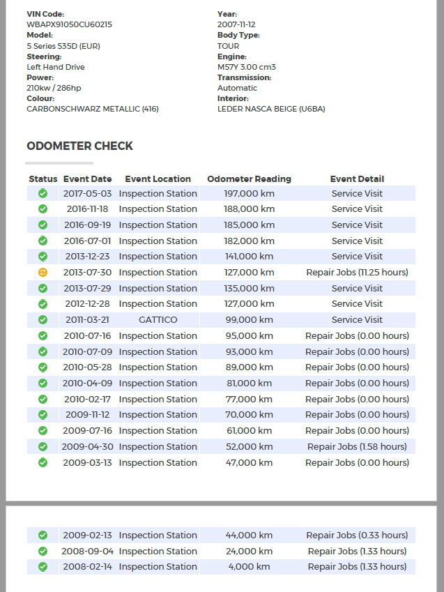 Ohessa Auto-Recordsin raportti. Jostain syystä yhdessä kohdassa kilometrit putoavat 135tkm --> 127tkm, jonka jäljkeen jatkuu taas ns normaalisti? Mitähän tuo keltainen pallukka vasemmassa laidassa vihreän sijaan tarkoittaa :think