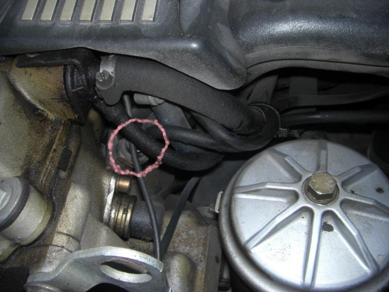 hmm, mites mä tossa moottorin päässä teen, siinä kun on ne kaks letkua edelleen. Tossa missä on ympyröity, vähän osu joku paksu letku eteen..