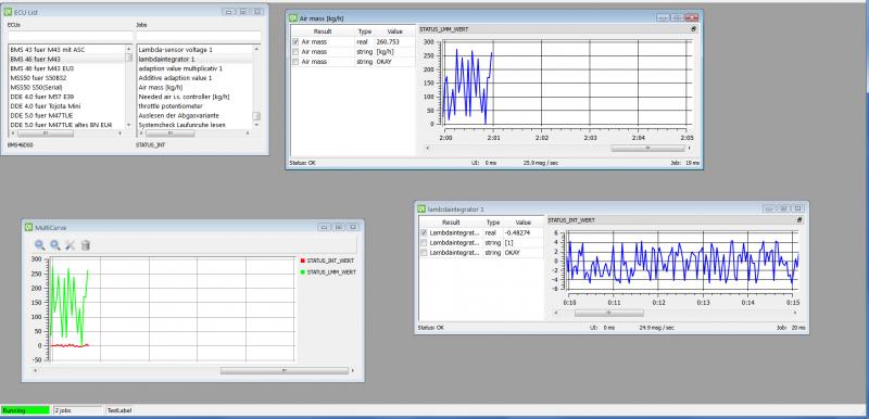 Nuo molemmat ihkan jobit toimii yksinään mutta jos laitan kummankin päälle yrittää testo ajaa molemmissa ikkunoissa, mun mielestä synkassa, tuota jobia vaihdellen argumenttia ID;0xD983 ja ID;0xD984. Eli kummassakin ikkunassa välkkyy vuorotellen ptc lämpötila ja ptc virta/jännite. Ohjelma jumii tuossa tilassa aika nopeasti. Ei myöskään saa graafia piirrettyä kun ikkuna nollautuu jatkuvasti. Tuon dde-jobin kanssa jompi kumpi ihkan jobi toimii niin kuin pitääkin. Ongelma varmaankin liittyy tuohon että kummassakin custom-jobissa on sama oikea jobi eri argumentilla. Yhteen status_lesen-jobiin ei muuten voi laittaa kun yhden argumentin, tästä ei siis ole apua.